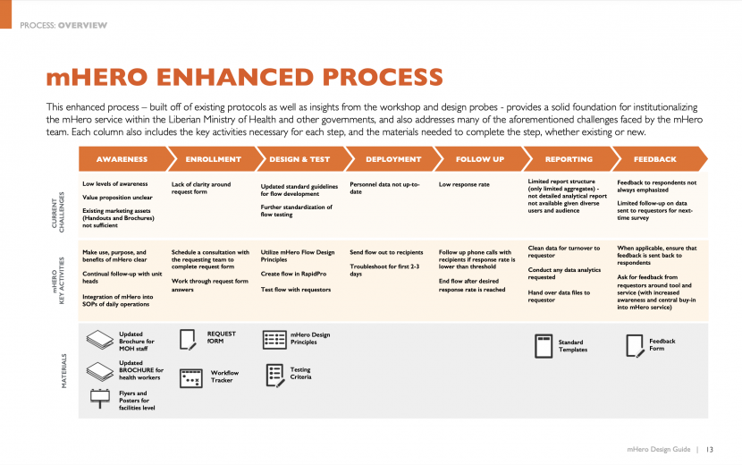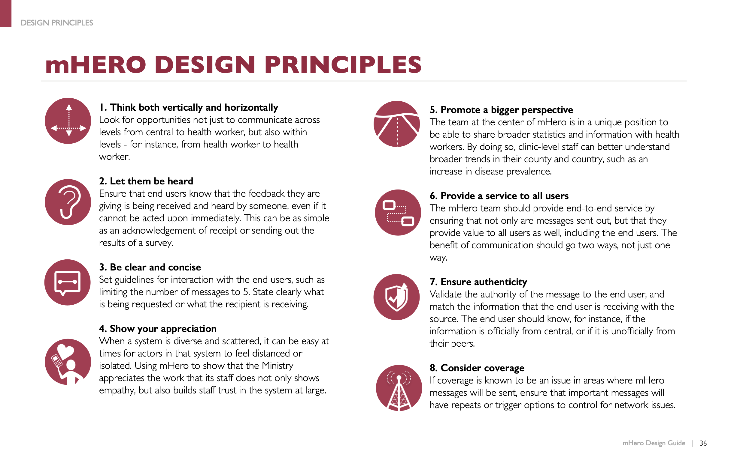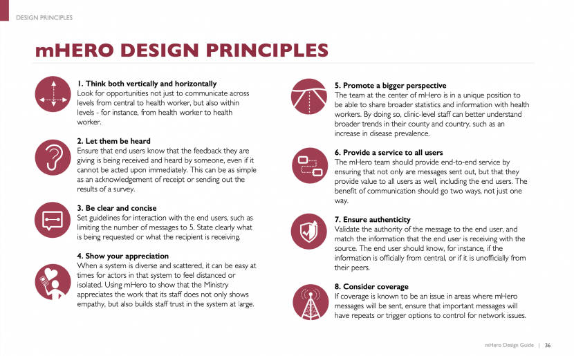 Outputs: Our team submitted a meticulously crafted mHero Design Guide to USAID, which ultimately served as a base for mHero’s now-extensive respository of supporting documentation, which can be found here.