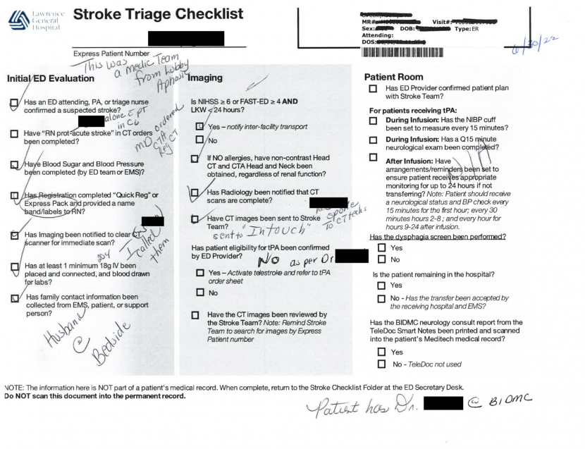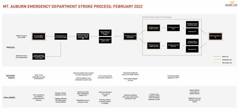 Process: Our team from Ariadne Labs recruited two partner hospitals in the Boston area – Mount Auburn and Lawrence General – to design, test, and pilot a new EVT stroke management checklist within their emergency departments. As the project’s design lead, I led the initial process of researching workflows and designing the checklists with the MAH and LGH stroke teams (which included ED physicians, neurologists, nurses, imaging technicians, administrators, and more). Since this work was conducted in the midst of the COVID-19 pandemic, the project was conducted remotely, with only one site visit conducted once it was safe to do so. Together, we mapped out the stroke management process in each ED, explored the physical and mental spaces that each step occupied, identified areas for improvement, and developed a new stroke checklist customized to fit each ED’s needs. The checklist was field-tested by the broader ED staff at each hospital before being formally piloted beginning in October 2022.