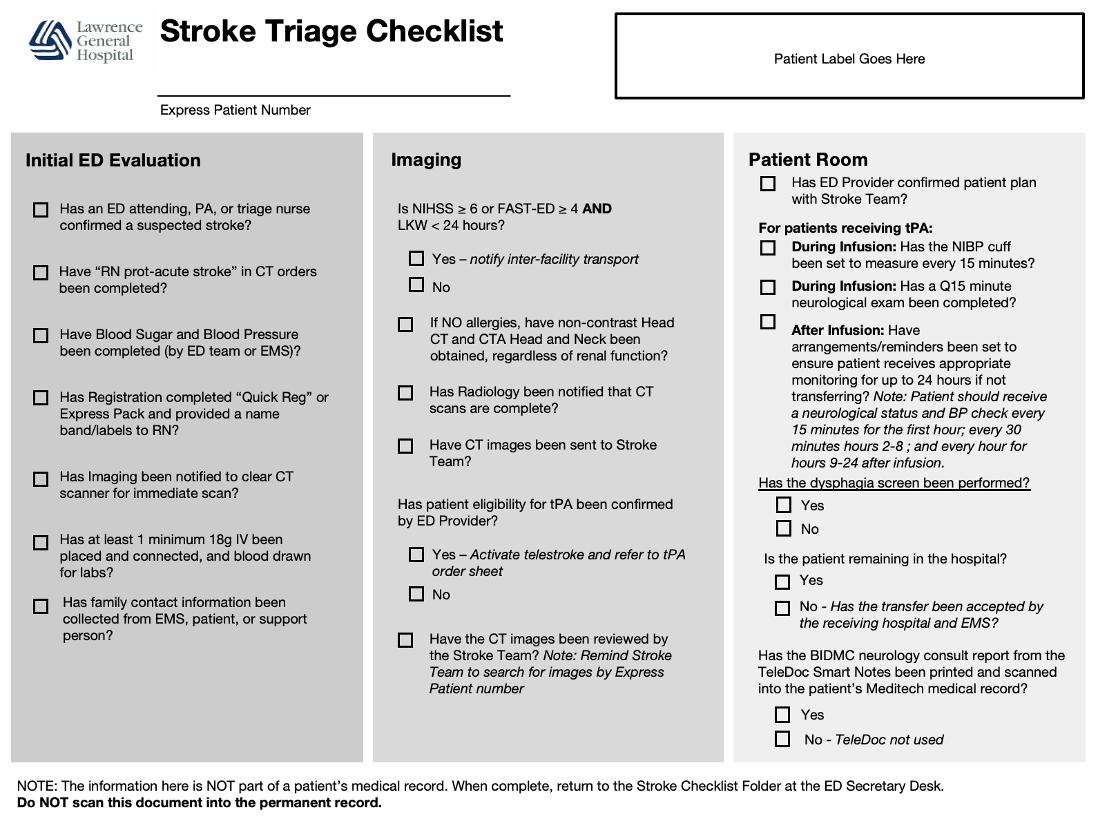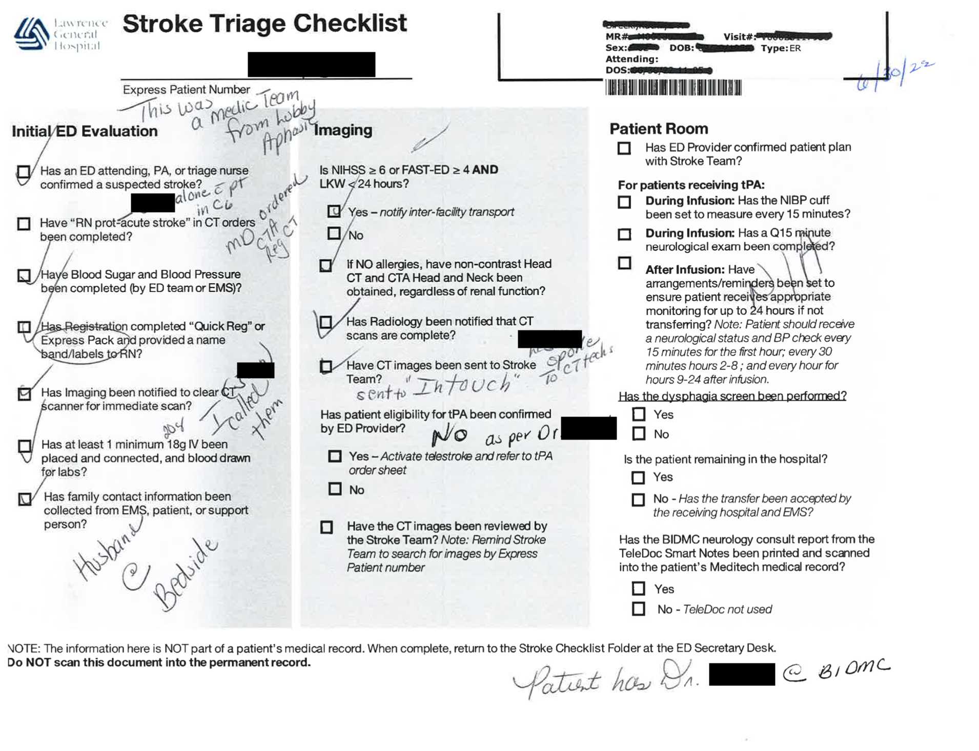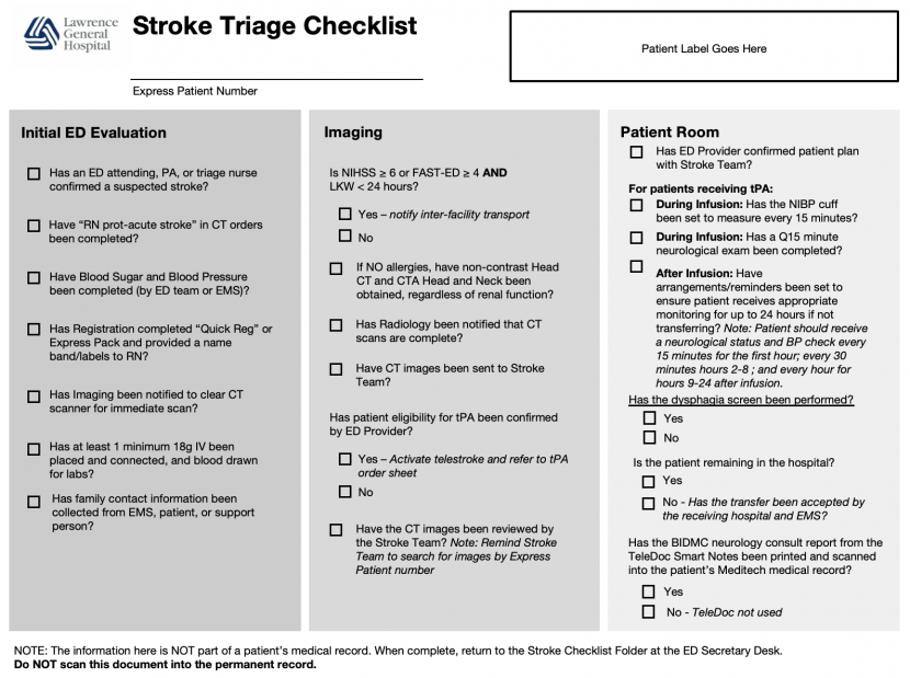 Opportunity: When a stroke case comes into the emergency department, time is of essence, and this is especially true for acute ischemic strokes, which can be eligible for a life-saving treatment called EVT (endovascular thrombectomy) if diagnosed in time.. Dr. Sandeep Kumar, a stroke neurologist at Beth Israel Deaconess Medical Center in Boston, noticed that EVT stroke case management was taking quite a bit longer than it should at both BIDMC as well as its partner hospitals, which transfer EVT cases to BIDMC. Checklists are commonly used in the healthcare field as a practical tool to support adherence to protocols, and the American Heart Association had published a stroke checklist in 2019 for general stroke management use. However, Dr. Kumar realized that this checklist could be better designed for EVT strokes, given how varied emergency departments EVT stroke management can be.